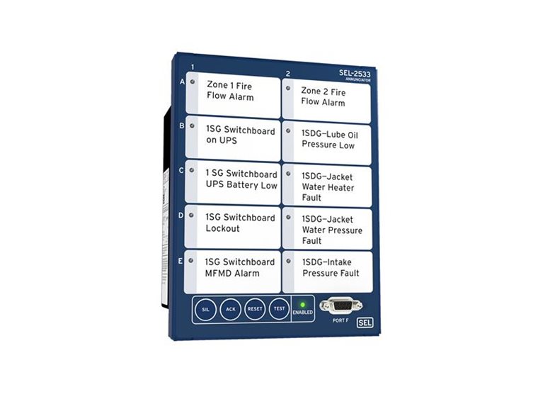 This compact, ten-window annunciator is ideal for displaying alarm conditions and notifying personnel of abnormal conditions in each individual rack, panel, generator, equipment block, power line terminal, assembly line, conveyor, or other apparatus. Communications ports on the annunciator enable many cost- and labor-saving configurations. For example, use the SEL-2533 Annunciator as a combined annunciator and field I/O module by wiring contact inputs and outputs to the SEL-2533 and then communicating digitally to a plant's distributed control system (DCS), SEL Real Time Automation Controller (RTAC), another SEL-2533 station computer, or other device. Or, order the SEL-2533 without any local I/O, and drive the annunciator inputs with information from remote devices via the communications ports.