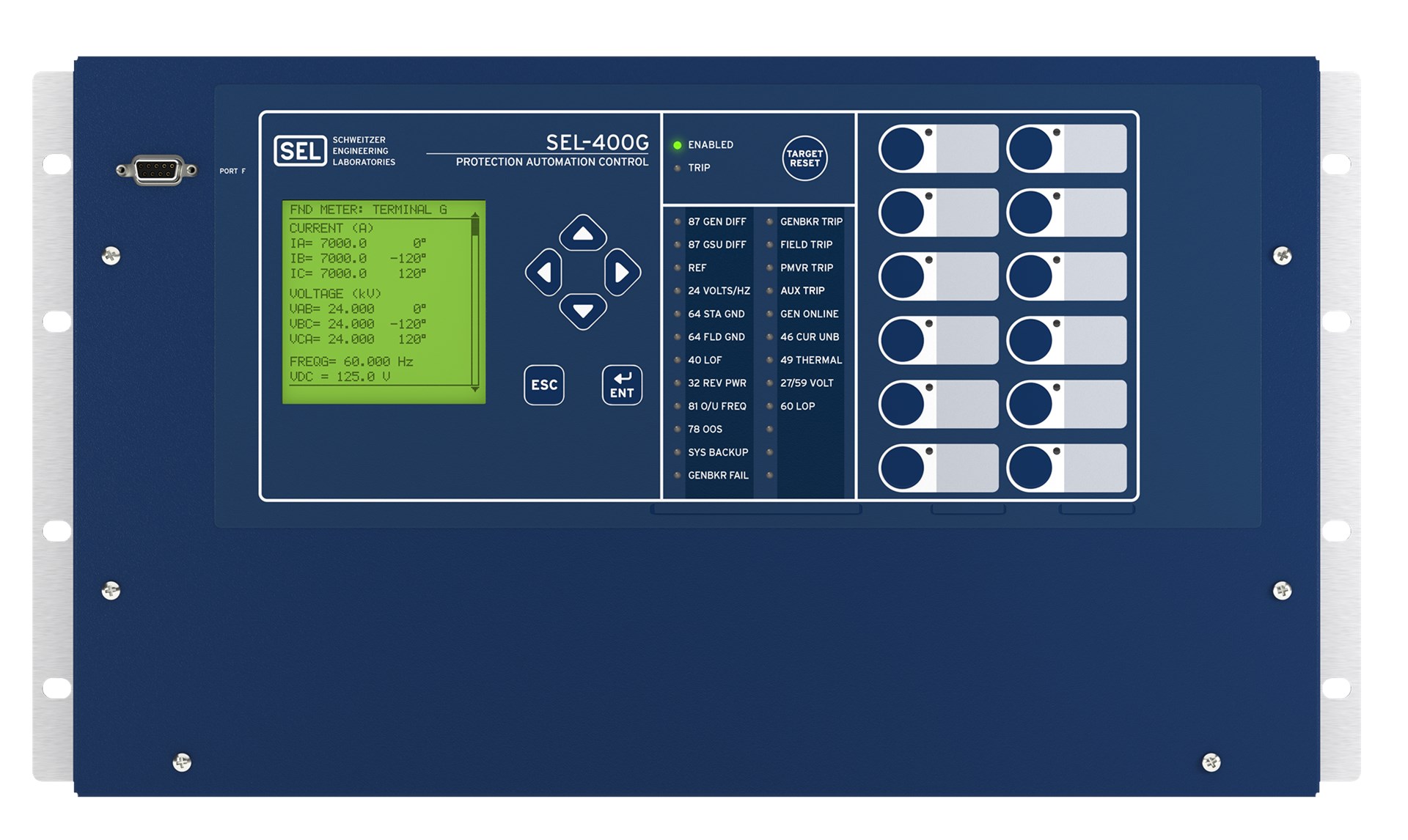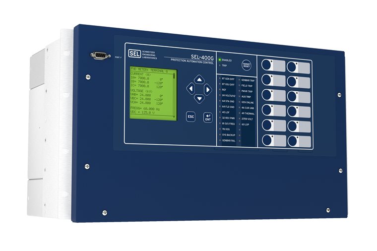 Advanced Generator Protection—Two independent universal differential elements provide protection for the generator and GSU transformer in a single relay. With its 18 current inputs, 6 voltage inputs, and wide-range frequency tracking (5–120 Hz), the SEL-400G can be applied in a wide variety of generator configurations. In addition, its advanced antimotoring protection and loss-of-field protection elements further protect your generator.