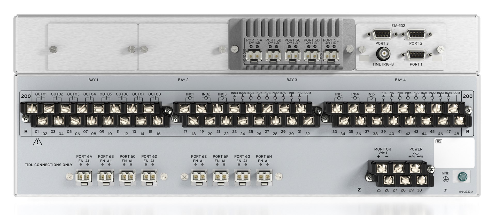 Eight SFP ports allow the TiDL relay to connect with eight remote SEL-TMU devices and to receive remote analog and digital data.