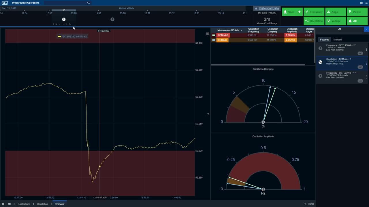 Percepção situacional de área ampla — o Synchrowave Operations melhora a percepção situacional, fornecendo informações ao vivo, de subsegundos e alinhadas ao tempo de todo o sistema de potência. As assinaturas em forma de onda fornecem informações adicionais sobre o comportamento dinâmico do sistema, o que melhora a tomada de decisões durante condições anormais.